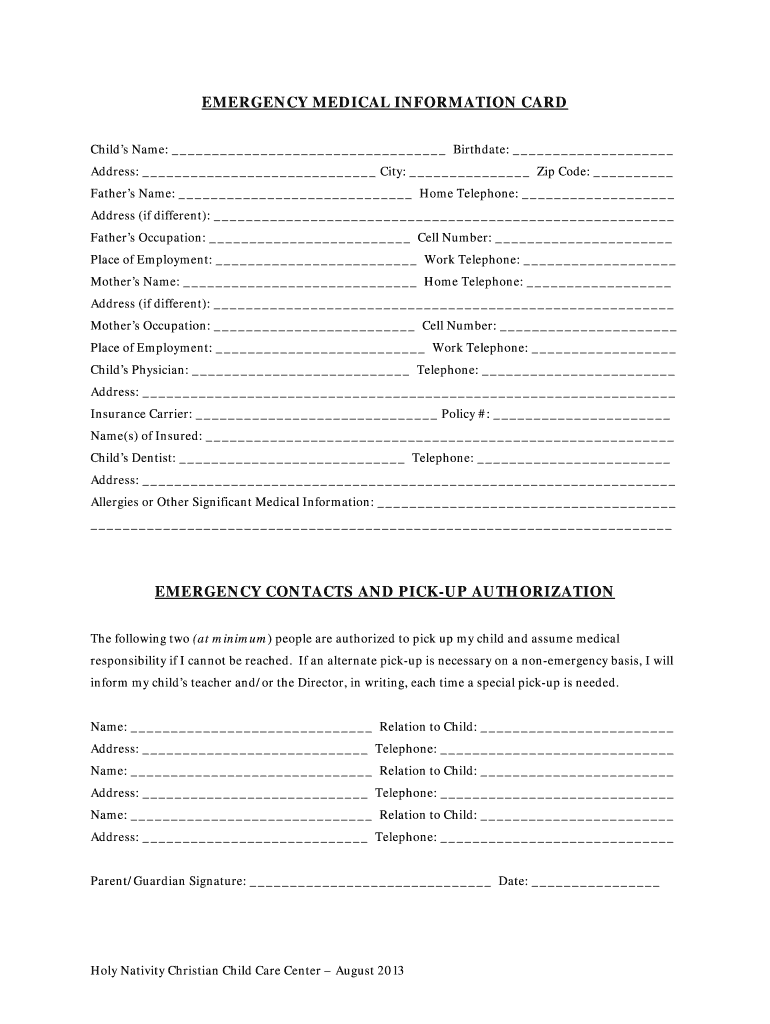 EMERGENCY MEDICAL INFORMATION CARD Child's Name: Birthdate: Address: City: Zip Code: Fathers Name: Home Telephone: Address (if different): Fathers Occupation: Cell Number: Place of Employment: Work
