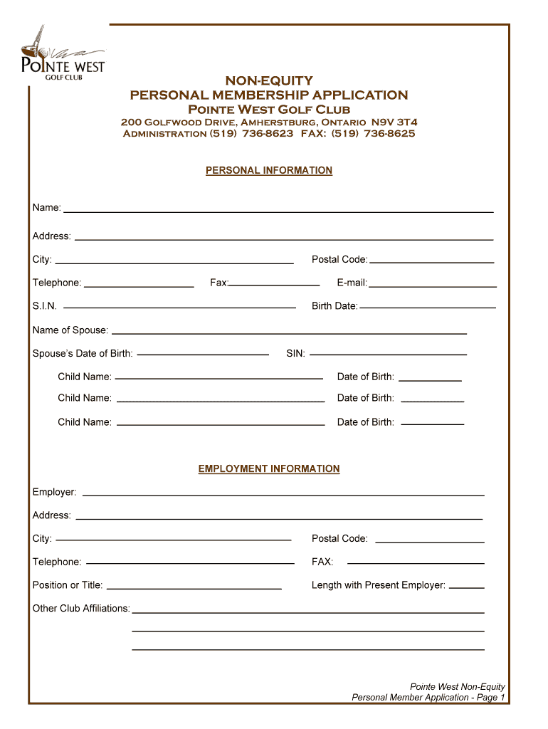 INEQUITY PERSONAL MEMBERSHIP APPLICATION Point West Golf Club 200 Golf wood Drive, Amherst burg, Ontario N9V 3T4 Administration (519× 7368623 FAX: (519× 7368625 PERSONAL INFORMATION Name: Address: