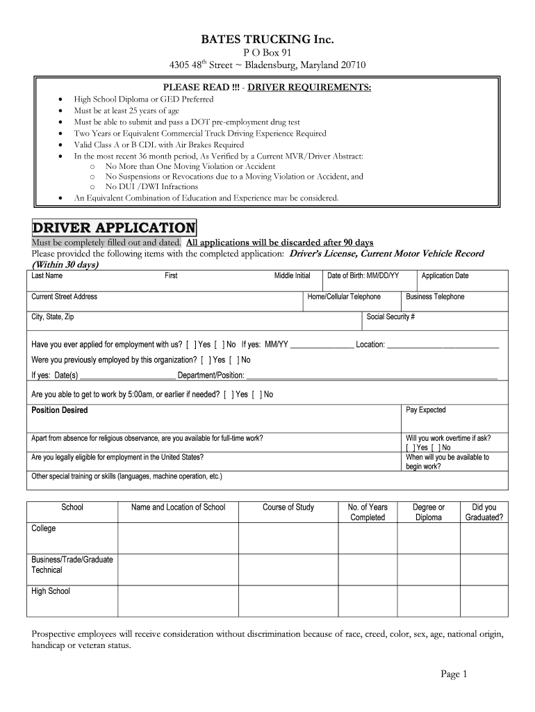 BATES TRUCKING Inc. P O Box 91 4305 48th Street Brandenburg, Maryland 20710 PLEASE READ !!! DRIVER REQUIREMENTS: High School Diploma or GED Preferred Must be at least 25 years of age Must be able