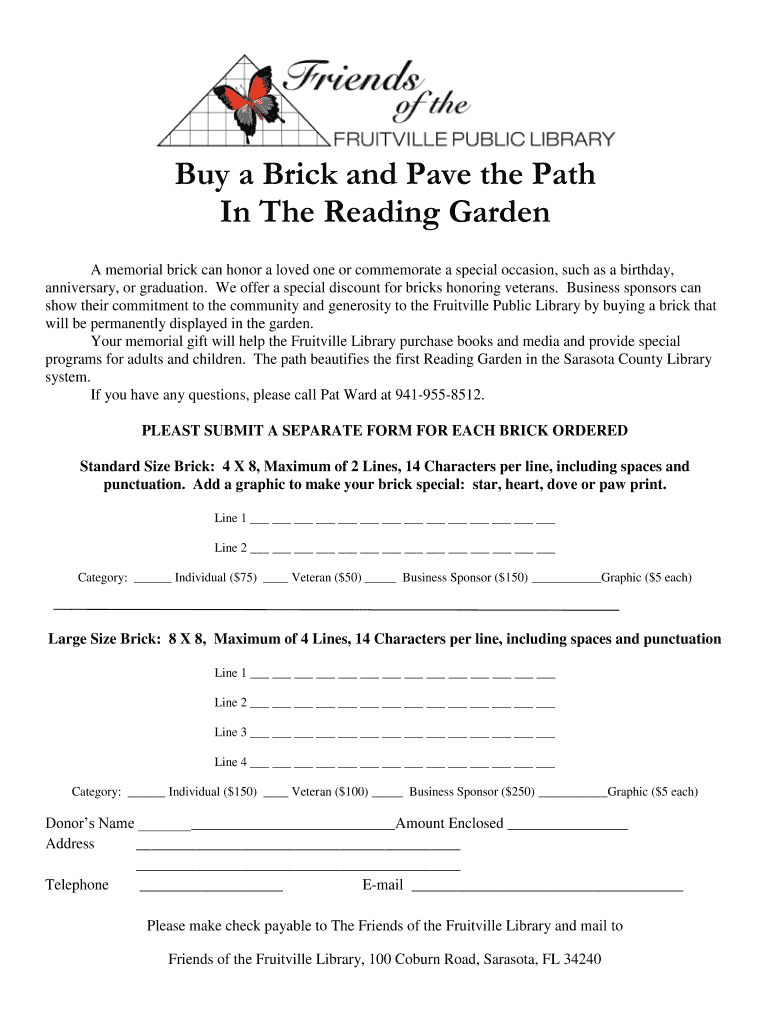 Get the free Buy a Brick and Pave the Path In The Reading Garden - friendsofthefruitvillelibrary