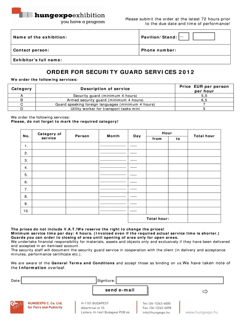 Please submit the order at the latest 72 hours prior to the due date and time of performance! Name of the exhibition: Pavilion×Stand: Contact person: Phone number: Exhibitors full name: ORDER FOR