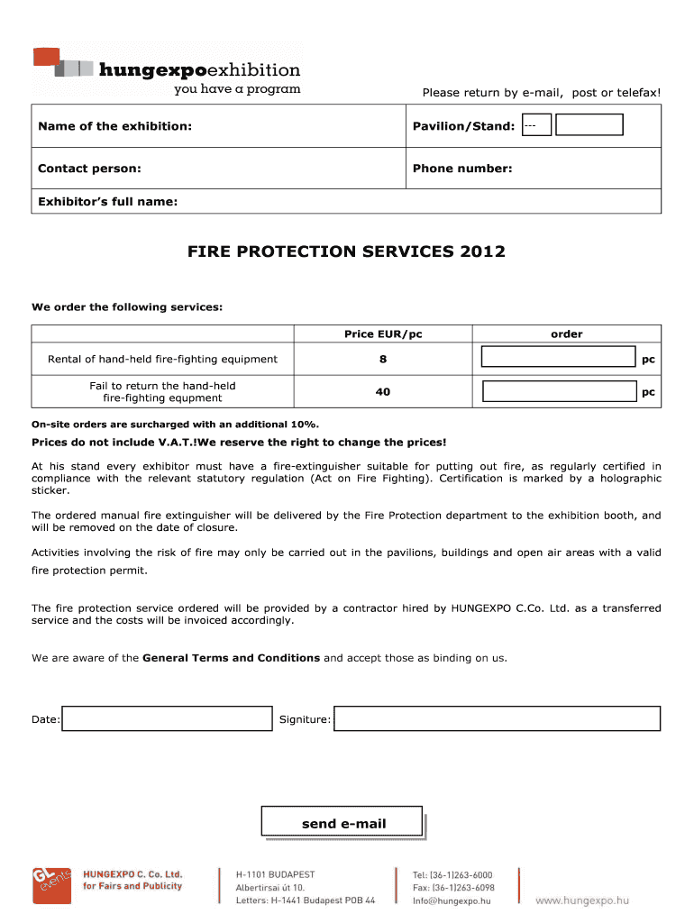 Please return by email, post or telefax! Name of the exhibition: Pavilion×Stand: Contact person: Phone number: Exhibitors full name: FIRE PROTECTION SERVICES 2012 We order the following services:
