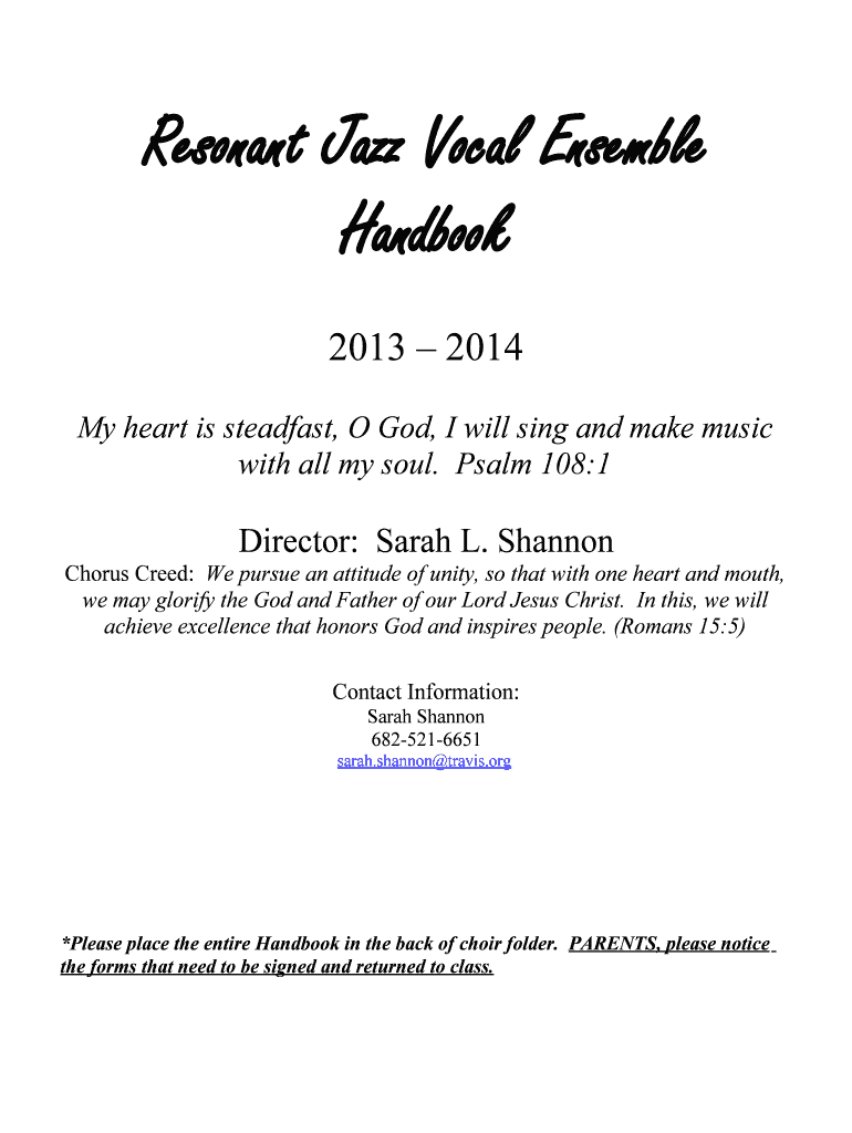 Resonant Jazz Vocal Ensemble Handbook 2013 2014 My heart is steadfast, O God, I will sing and make music with all my soul. Psalm 108:1 Director: Sarah L. Shannon Chorus Creed: We pursue an attitude