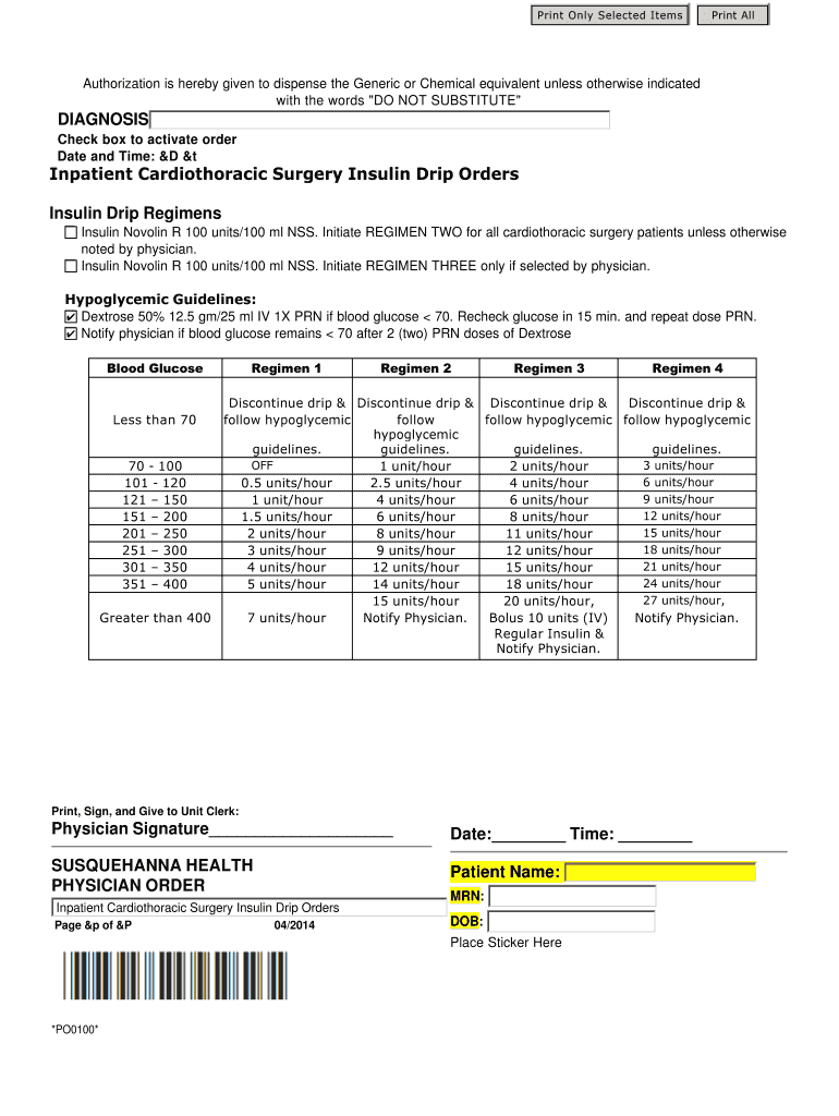 Get the free DIAGNOSIS Inpatient Cardiothoracic Surgery Insulin Drip Orders - tempportal susqueha...