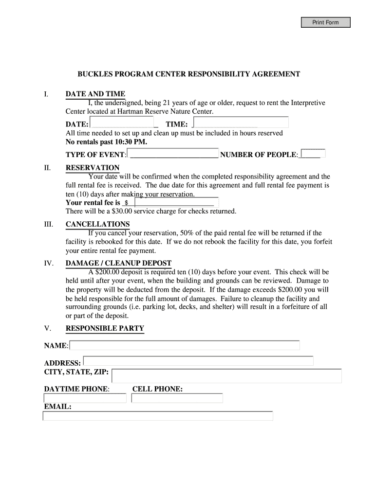 Print Form BUCKLES PROGRAM CENTER RESPONSIBILITY AGREEMENT I. DATE AND TIME I, the undersigned, being 21 years of age or older, request to rent the Interpretive Center located at Hartman Reserve Nature