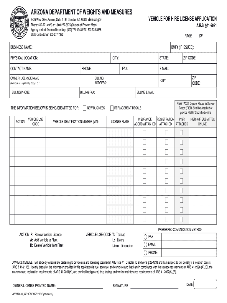 Get the free ARIZONA DEPARTMENT OF WEIGHTS AND MEASURES VEHICLE FOR HIRE LICENSE APPLICATION 4425...