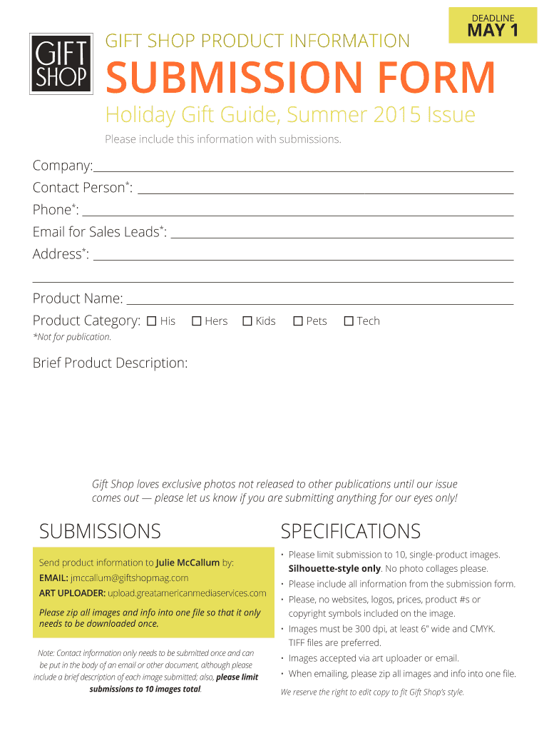 DEADLINE GIFT SHOP PRODUCT INFORMATION MAY 1 SUBMISSION FORM Holiday Gift Guide, Summer 2015 Issue Please include this information with submissions. Company: Contact Person*: Phone*: Email for Sales