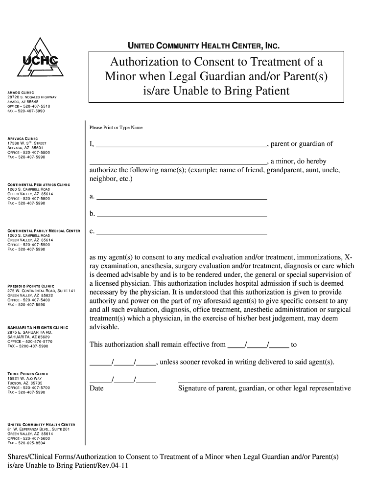 UNITED COMMUNITY HEALTH CENTER, INC. Authorization to Consent to Treatment of a Minor when Legal Guardian and/or Parent(s) is/are Unable to Bring Patient AMADO CLINIC 28720 S. NOGALES HIGHWAY AMADO,