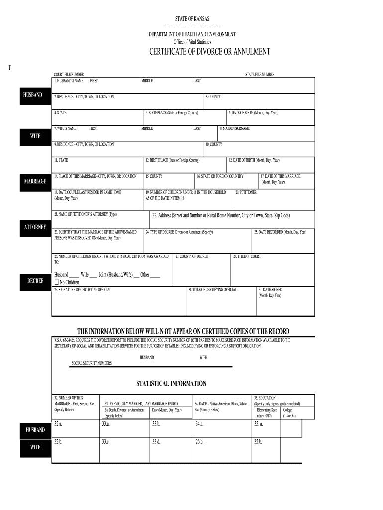 STATE OF KANSAS DEPARTMENT OF HEALTH AND ENVIRONMENT Office of Vital Statistics CERTIFICATE OF DIVORCE OR ANNULMENT T COURT FILE NUMBER 1. HUSBANDS NAME HUSBAND STATE FILE NUMBER FIRST MIDDLE LAST