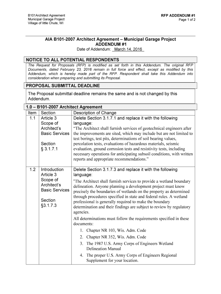 B101Architect Agreement Municipal Garage Project Village of little Chute, WI RFP ADDENDUM #1-Page 1 of 2AIA B1012007 Architect Agreement Municipal Garage Project ADDENDUM #1 Date of Addendum: March