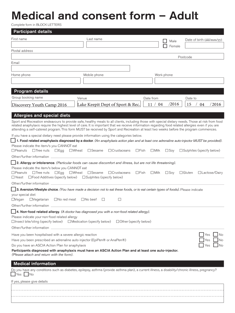 Medical and consent form Adult Complete form in BLOCK LETTERS Participant details First name Last name n Date of birth (dd/mm/by) Male Female Postal address Postcode Email Home phone Mobile phone