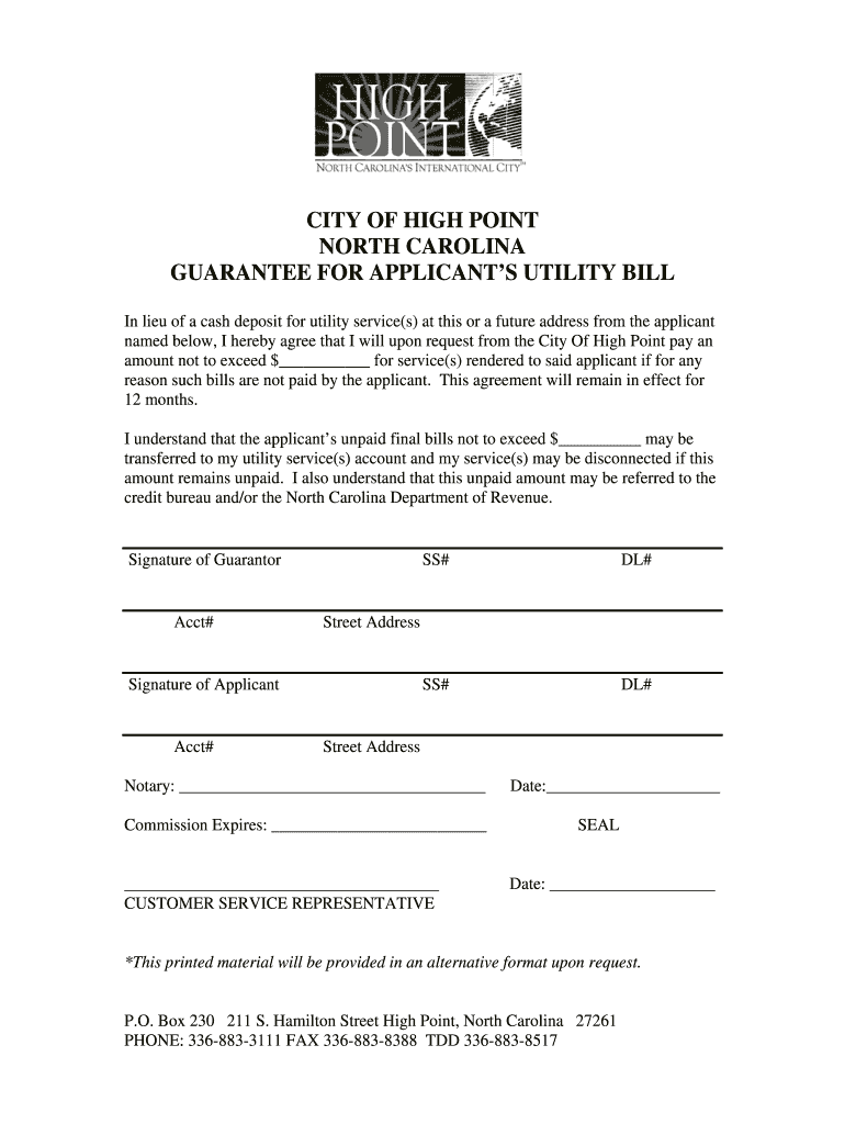 CITY OF HIGH POINT NORTH CAROLINA GUARANTEE FOR APPLICANTS UTILITY BILL In lieu of a cash deposit for utility service(s) at this or a future address from the applicant named below, I hereby agree