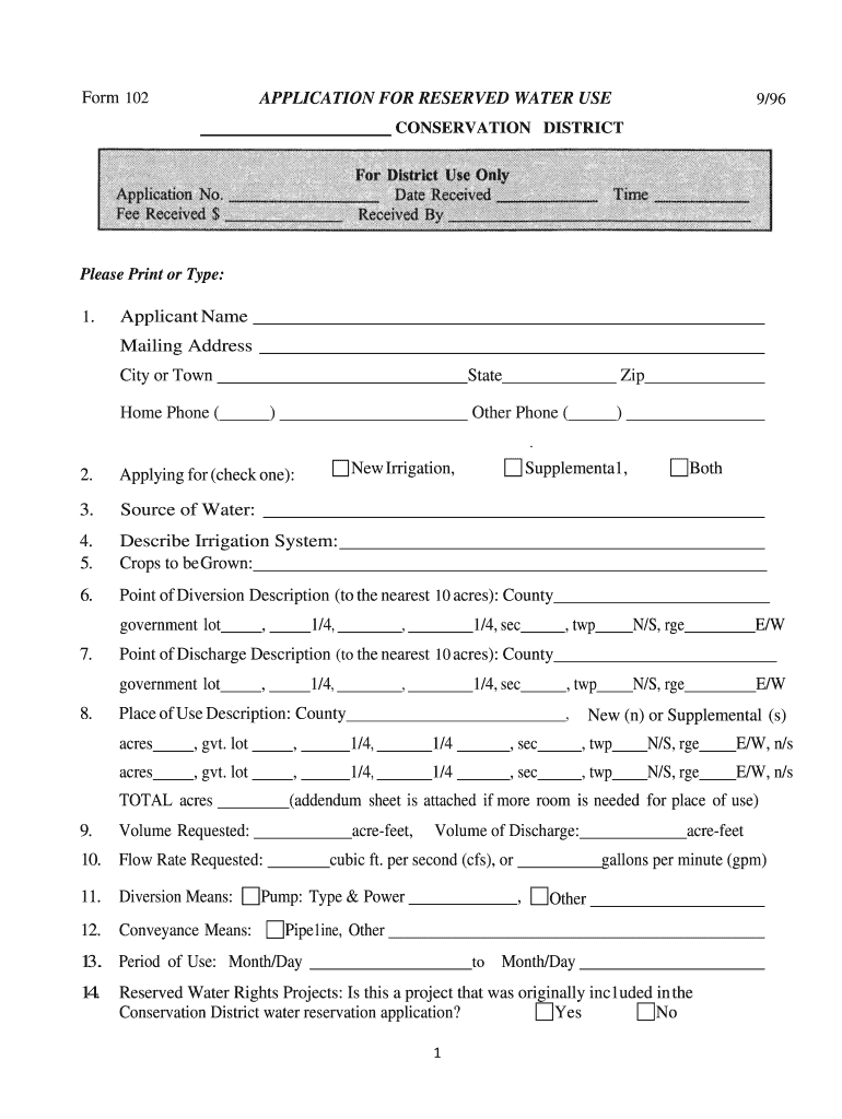 Form 102APPLICATION FOR RESERVED WATER USE9/96CONSERVATION DISTRICTPlease Print or Type:
