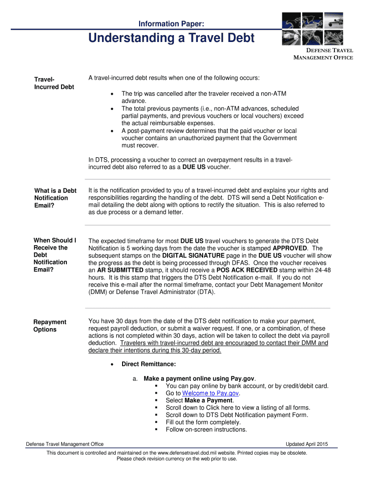 This document provides information about travel-incurred debt, notification process, repayment options, and rights regarding the handling of such debts.