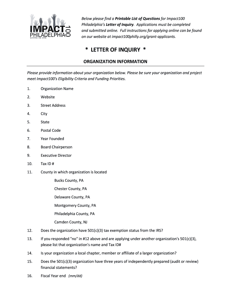 Below please find a Printable List of Questions for Impact100 Philadelphia s Letter of Inquiry. Applications must be completed and submitted online. Full instructions for applying online can be found