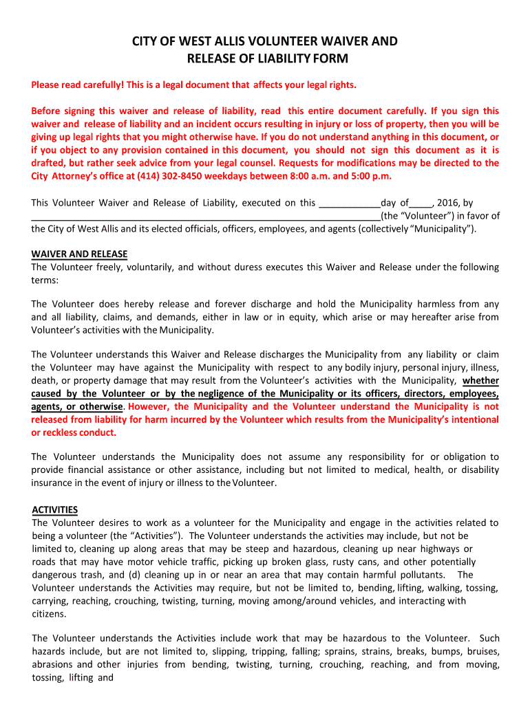 Get the free city of west allis volunteer waiver and release of liability form