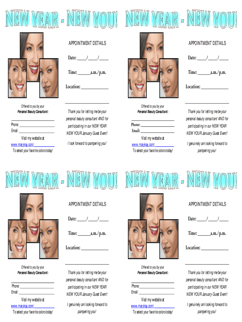 APPOINTMENT DETAILS Date: / / Visit my website at www.marykay.com/ To select your favorite colors today! Time: a.m./p.m. Location: Phone: Email: Date: / / Time: a.m./p.m. Offered to you by your Personal