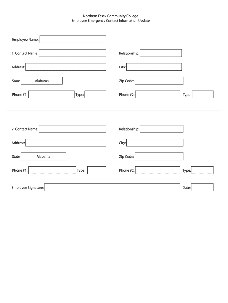 Northern Essex Community College Employee Emergency Contact Information Update Employee Name: 1. Contact Name: Relationship: Address: City: State Alabama Phone #1: Zip Code: Type: Phone #2: 2. Contact
