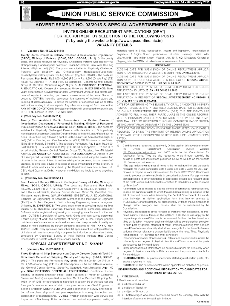 WWW.employment news.gov.in 40 Employment News 14 20 February 2015 UNION PUBLIC SERVICE COMMISSION http://www.jlatest.com/ ADVERTISEMENT NO. 03/2015 & SPECIAL ADVERTISEMENT NO. 51/2015 INVITES ONLINE