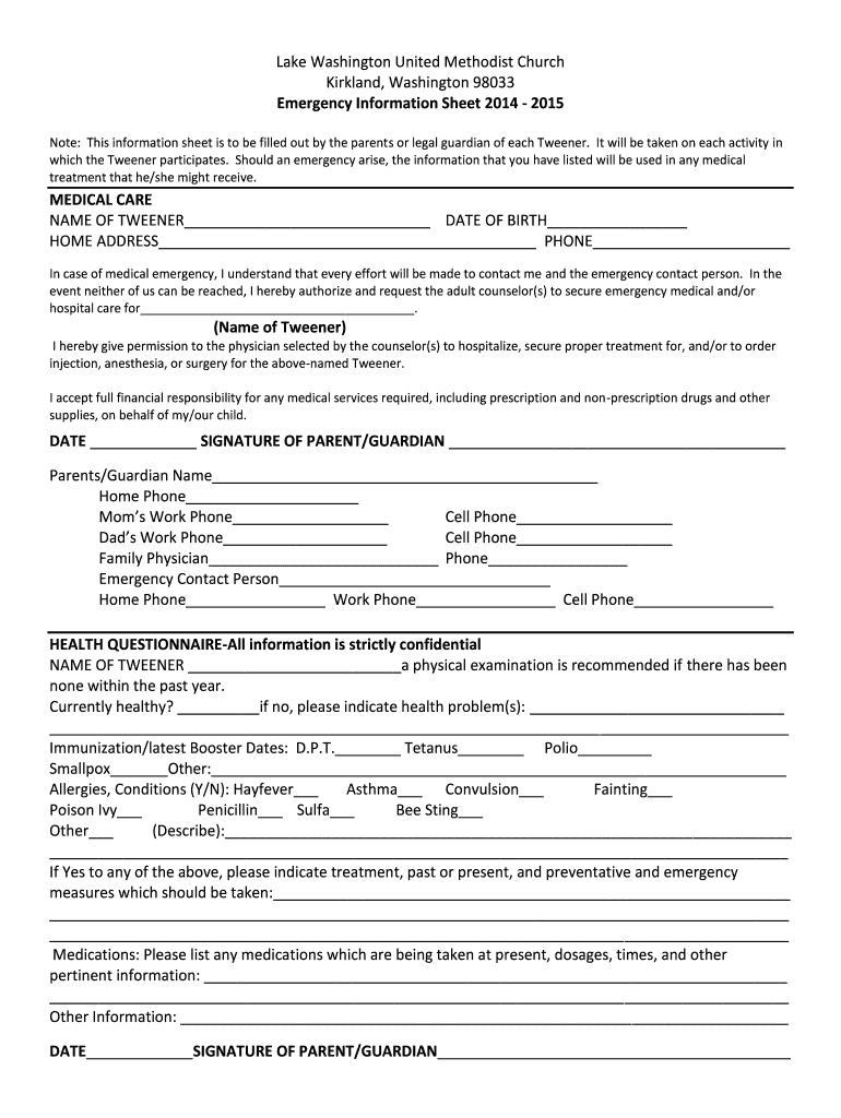 Lake Washington United Methodist Church Kirkland, Washington 98033 Emergency Information Sheet 2014 2015 Note: This information sheet is to be filled out by the parents or legal guardian of each Tweeter.