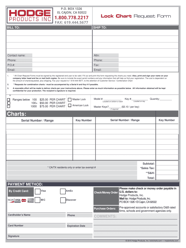 HODGE P.O. BOX 1326 EL CAJON, CA 92022 Lock Chart Request Form P R O D U C T S I N C 1.800.778.2217 FAX: 619.444.5677 BILL TO: SHIP TO: Contact name: Attn: Phone: Phone: P.O.#: Fax: Email: Email: