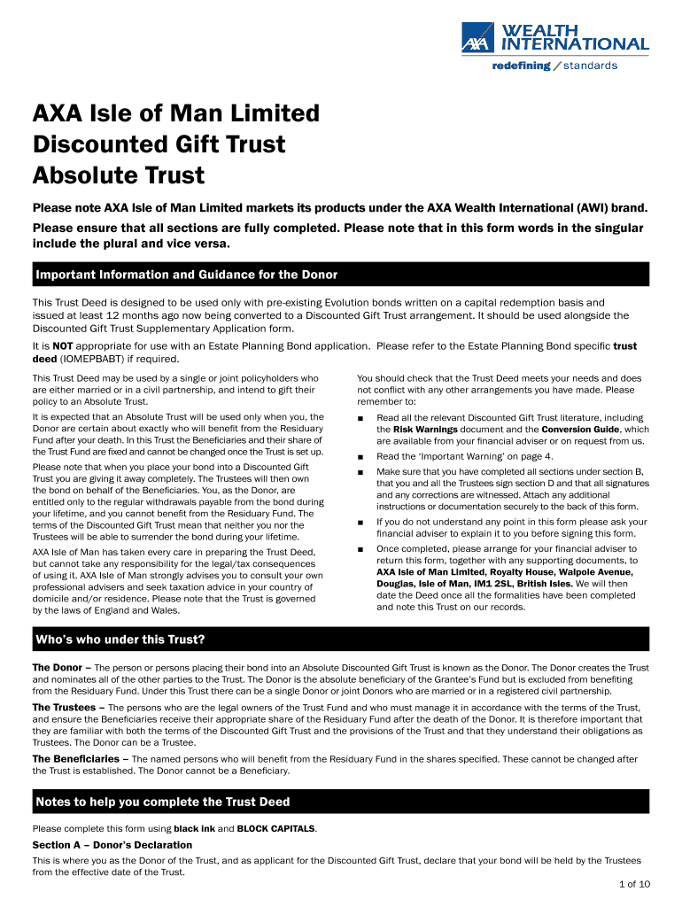 Get the free AXA Isle of Man Limited Discounted Gift Trust Absolute ... - AXA Wealth - axawealth co