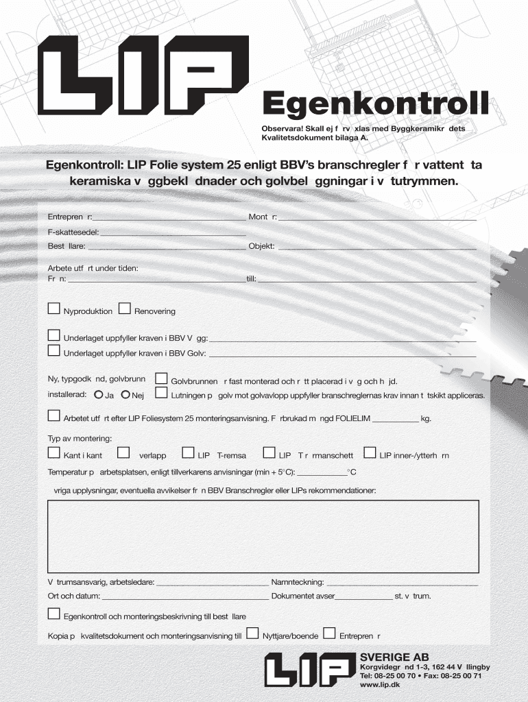 Egenkontroll Observer! Small ex formulas med Byggkeramikrdets Kvalitetsdokument bilge A. Egenkontroll: LIP Folio system 25 enlist BBS branschregler for Valletta ceramist vggbekldnader och golvbelggningar