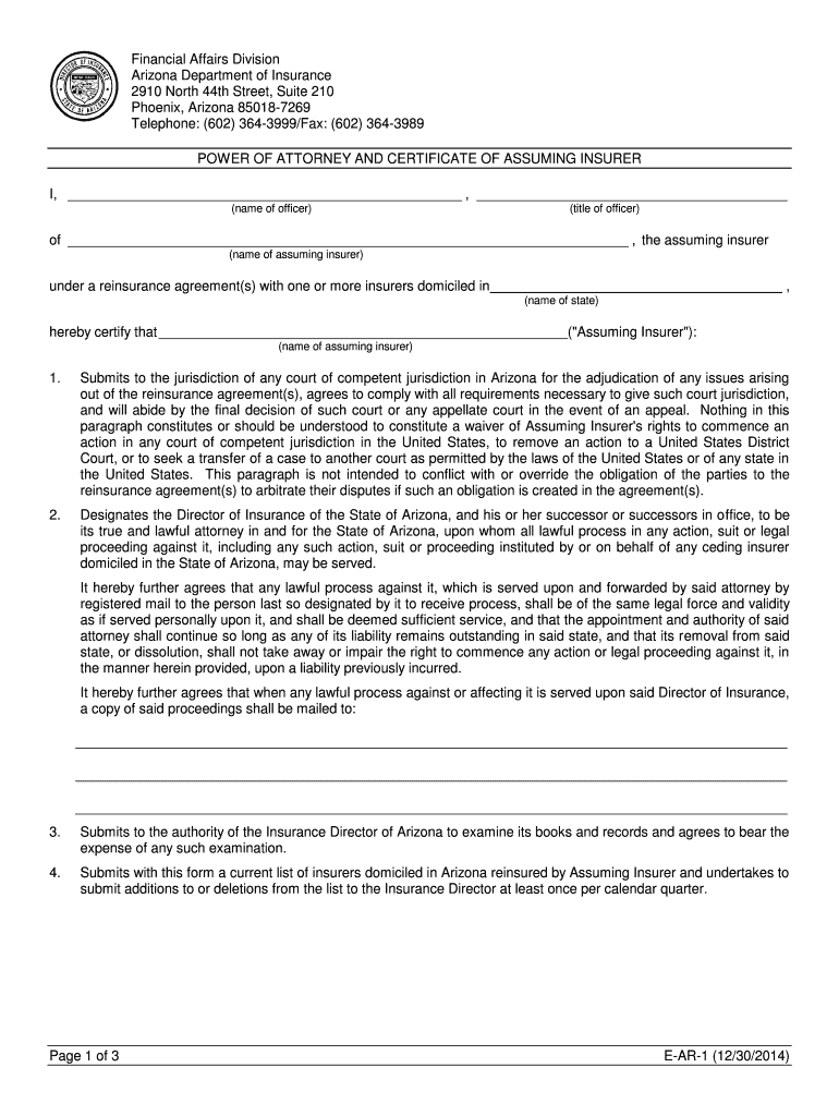 Financial Affairs Division Arizona Department of Insurance 2910 North 44th Street, Suite 210 Phoenix, Arizona 850187269 Telephone: (602) 3643999/Fax: (602) 3643989 POWER OF ATTORNEY AND CERTIFICATE