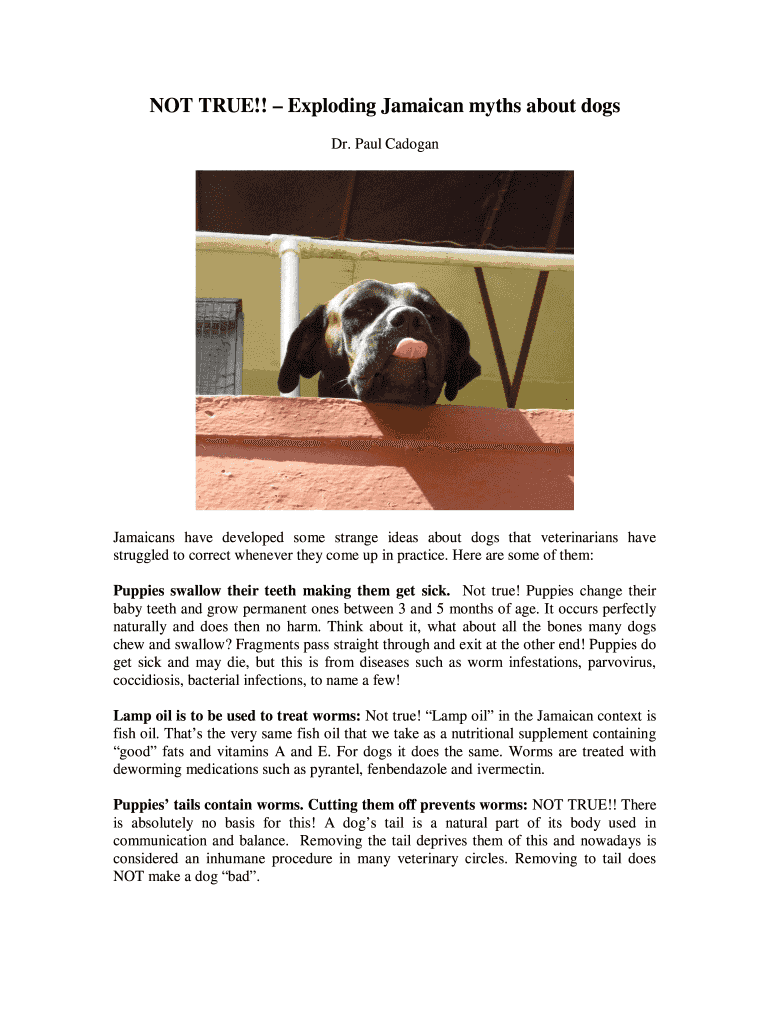 NOT TRUE!! Exploding Jamaican myths about dogs Dr. Paul CadoganJamaicans have developed some strange ideas about dogs that veterinarians have struggled to correct whenever they come up in practice.