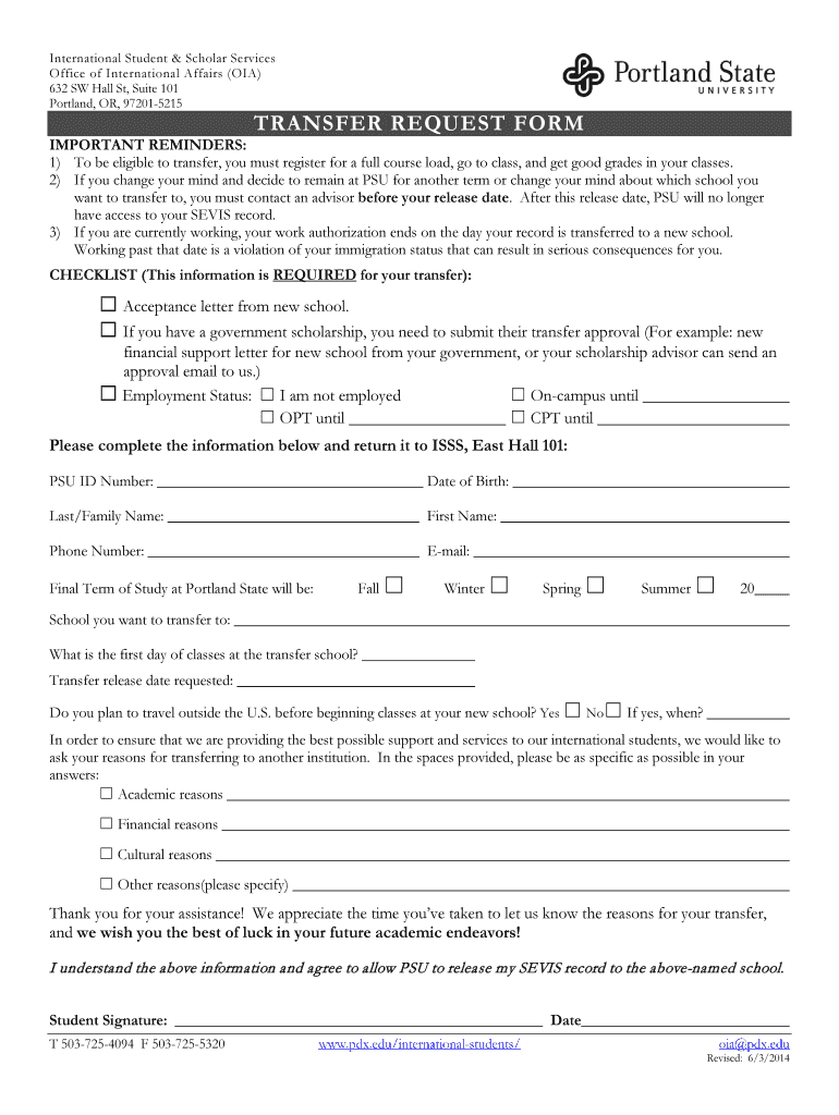 International Student & Scholar Services Office of International Affairs (OIL) 632 SW Hall St, Suite 101 Portland, OR, 972015215 TRANSFER REQUEST FORM IMPORTANT REMINDERS: 1) To be eligible to transfer,
