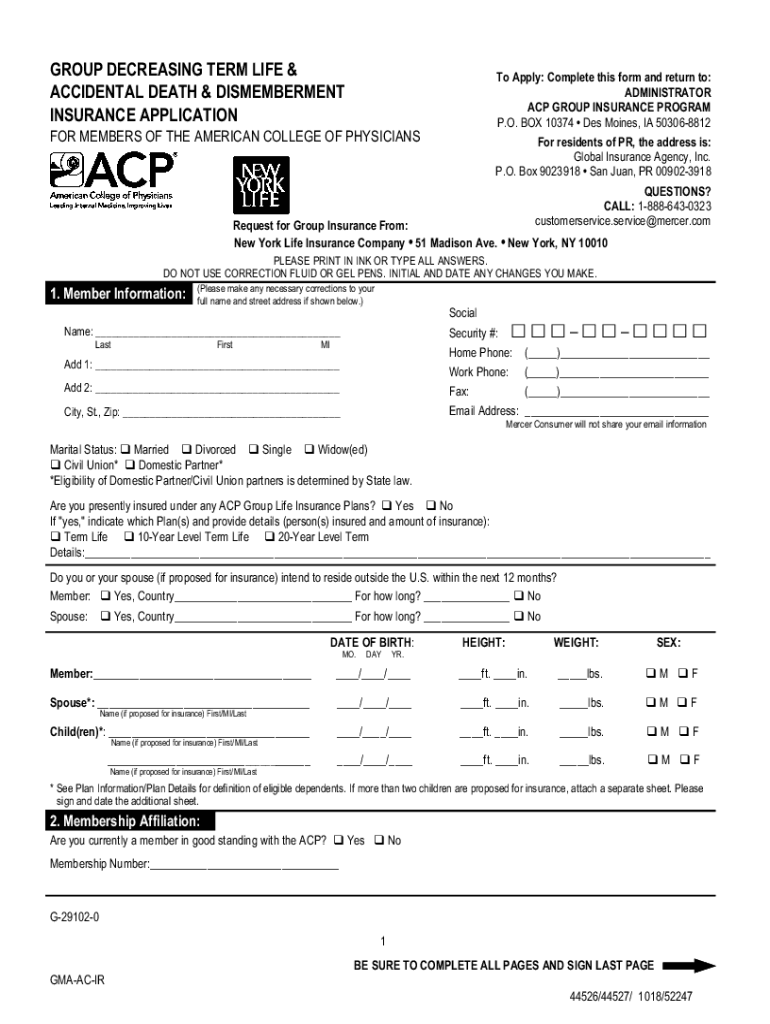 The ACP Group Life Insurance Application is a form used by members of the American College of Physicians to apply for group decreasing term life and accidental death & dismemberment insurance.