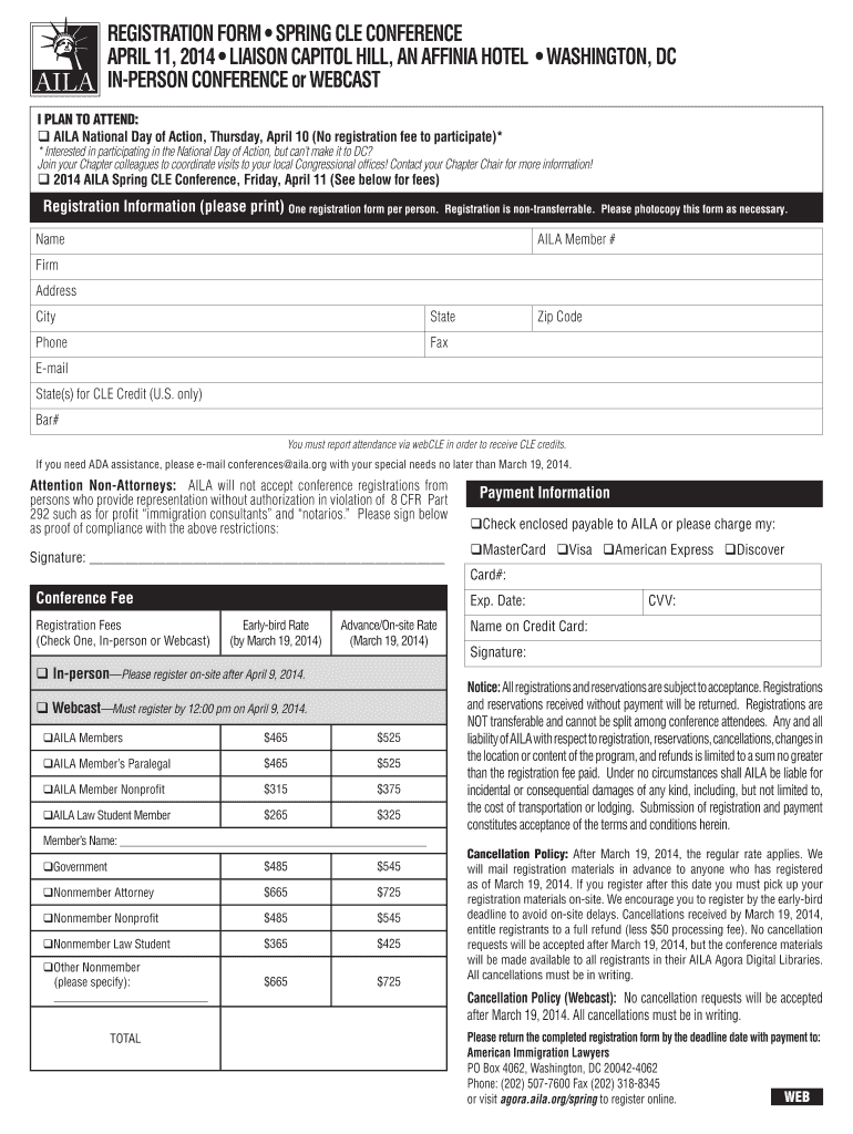 This form is for registering participants for the AILA Spring CLE Conference, providing options for attendance and associated fees.