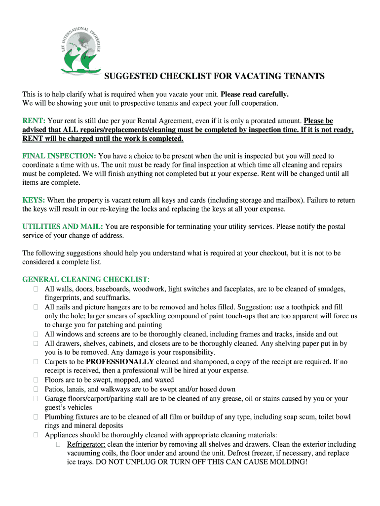 Get the free SUGGESTED CHECKLIST FOR VACATING TENANTS