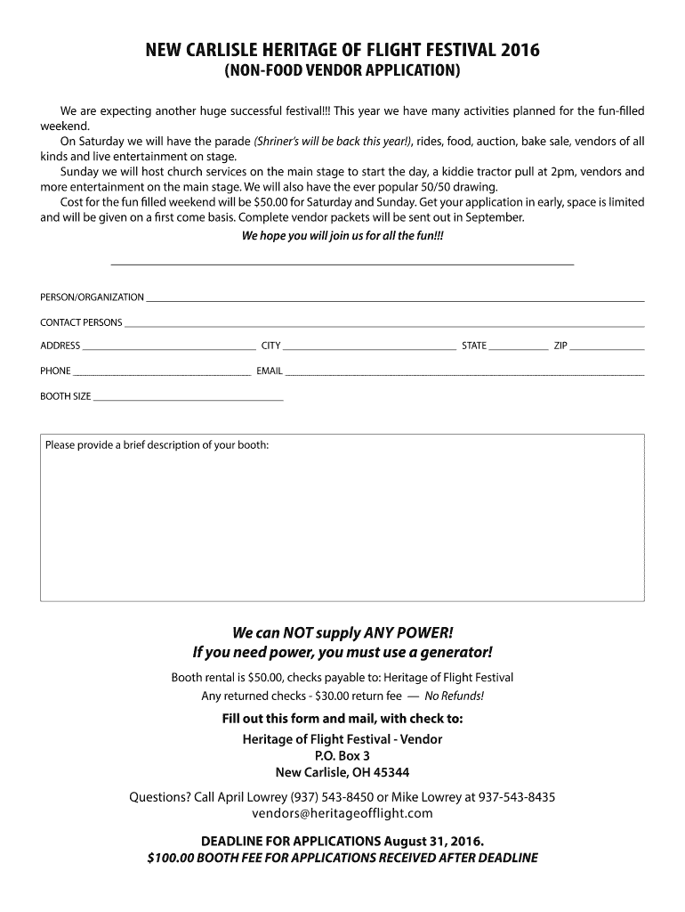 NEW CARLISLE HERITAGE OF FLIGHT FESTIVAL 2016 (NONFOOD VENDOR APPLICATION) We are expecting another huge successful festival!!! This year we have many activities planned for the fulfilled weekend.