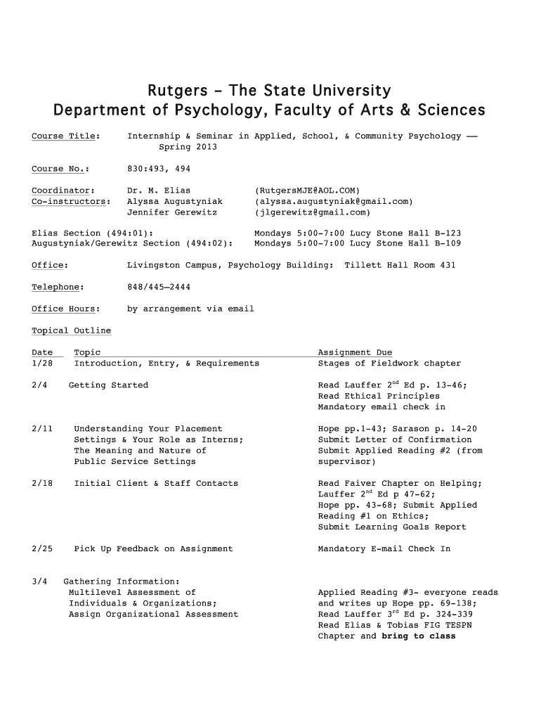 Rutgers The State University Department of Psychology, Faculty of Arts & Sciences Course Title: Internship & Seminar in Applied, School, & Community Psychology Spring 2013 Course No.: 830:493, 494