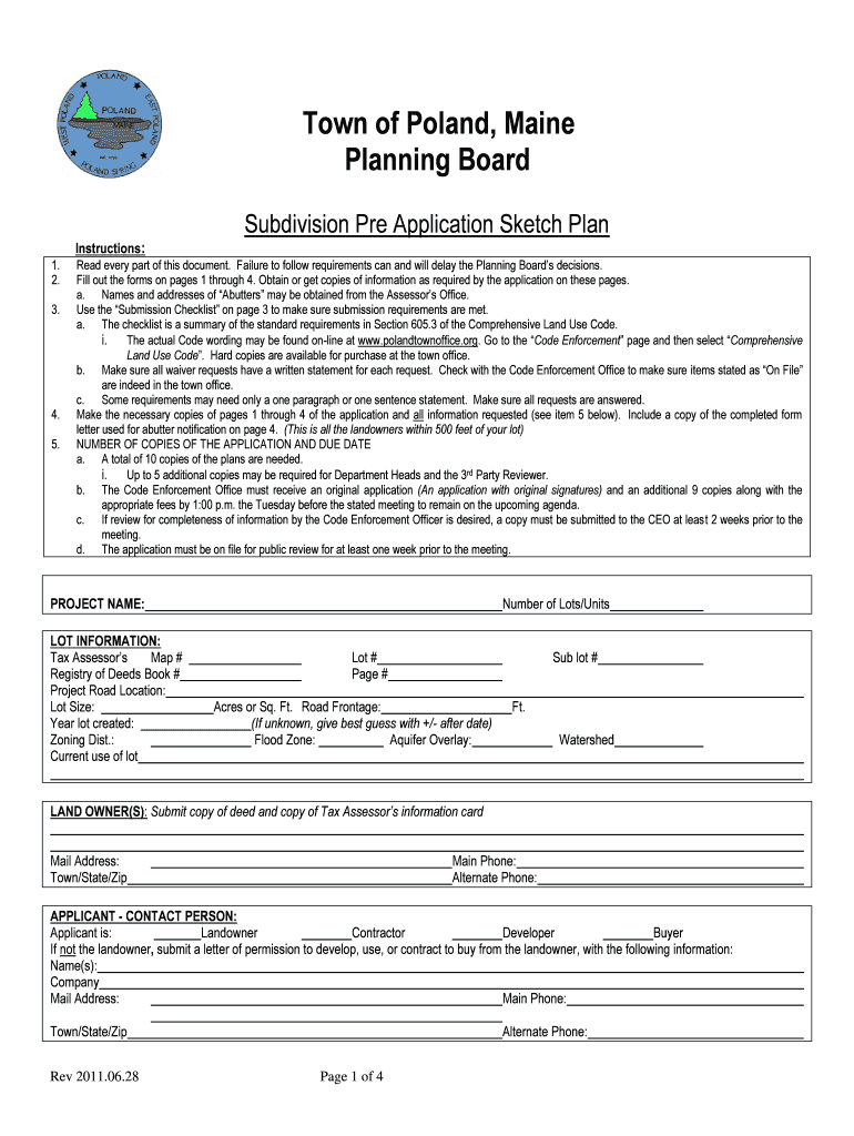 This document outlines the required procedures and information needed for submitting a pre-application sketch plan for a subdivision in the Town of Poland, Maine. It includes instructions for completing