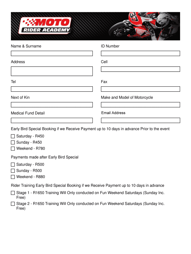 Name & Surname ID Number Address Cell Tel Fax Next of Kin Make and Model of Motorcycle Medical Fund Detail Email Address Early Bird Special Booking if we Receive Payment up to 10 days in advance Prior