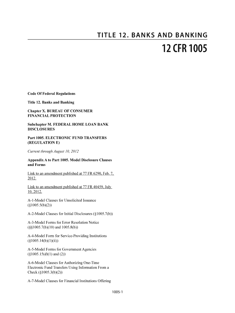 12 CFR 1005 refers to the regulation under the Consumer Financial Protection Bureau that implements the Electronic Fund Transfer Act (EFTA) and provides rules regarding electronic fund transfers, including disclosures to consumers.