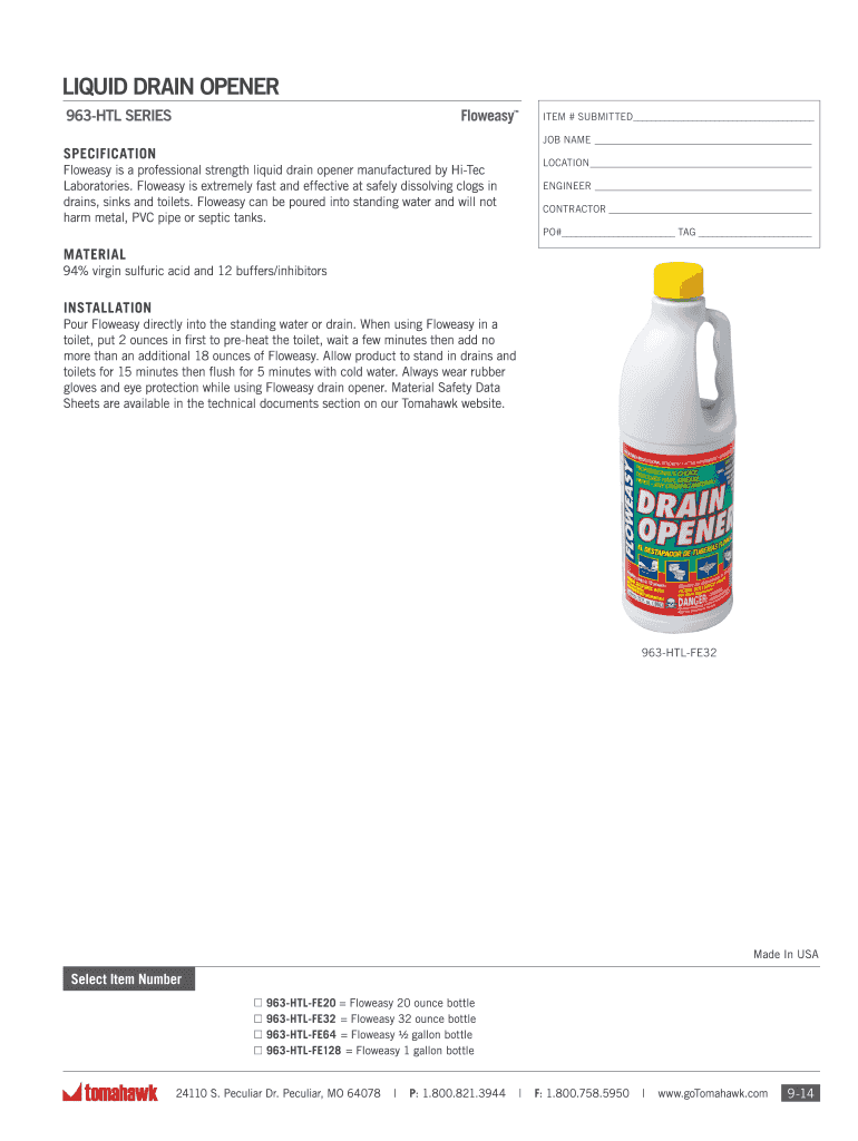 LIQUID DRAIN OPENER 963HTL SERIES Flow easy ITEM # SUBMITTED JOB NAME SPECIFICATION LOCATION Flow easy