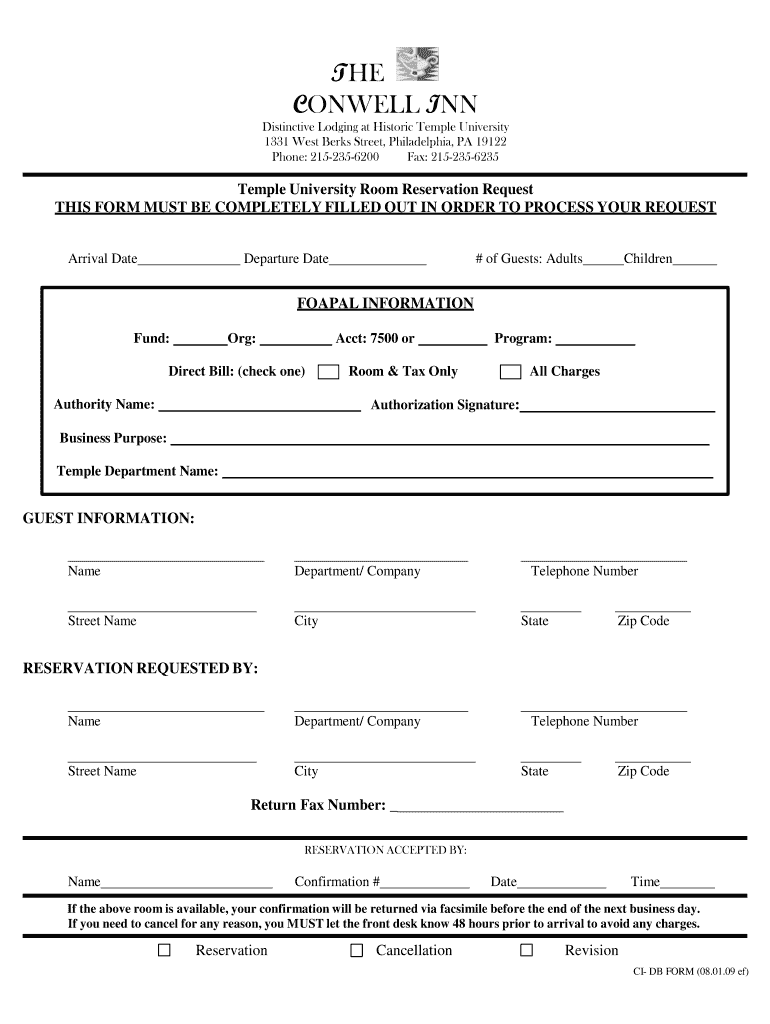 The Temple University Room Reservation Request is a crucial form used to facilitate lodging requests at The Conwell Inn, which plays an integral role in the university's accommodation offerings. This form is especially significant for individuals and departments needing a reliable way to secure lodging during their visits. The Conwell Inn itself holds historical importance as part of Temple University, making this reservation process not only functional but also a nod to the institution's heritage. Utilizing the temple university room reservation request ensures that all necessary details for your stay are accurately captured.