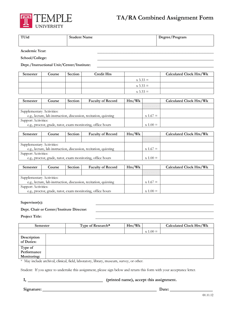 Get the free TA/RA Combined Assignment Form TUid Student Name Degree/Program Academic Year: Schoo...