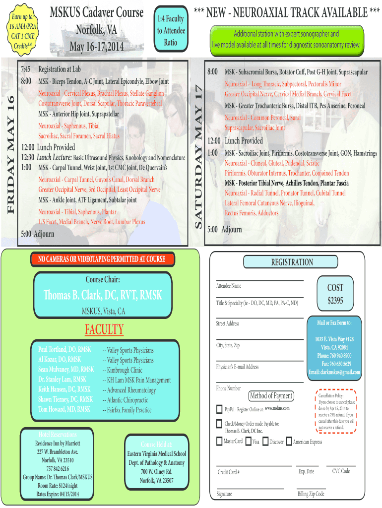 Earn up to: 16 AMA/PRA CAT 1 CME Credits TM MSK US Cadaver Course Norfolk, VA May 1617,2014 1:4 Faculty to Attendee Ratio Registration at Lab Costotransverse Joint, Dorsal Scapular, Thoracic Paravertebral
