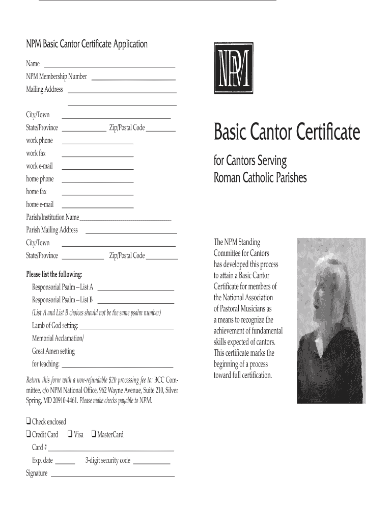 NPM Basic Cantor Certificate Application Name NPM Membership Number Mailing Address City/Town State/Province Zip/Postal Code work phone work fax work email home phone fax home email Parish/Institution