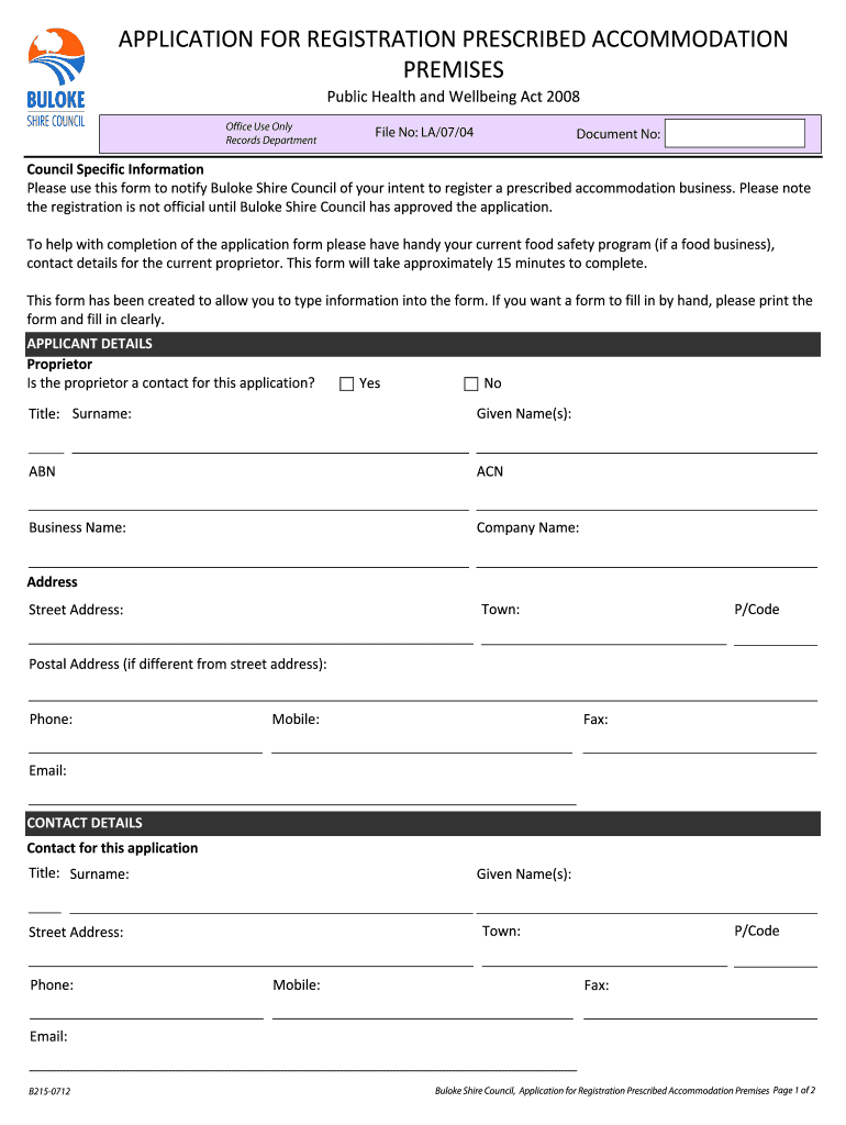APPLICATION FOR REGISTRATION PRESCRIBED ACCOMMODATION PREMISES Public Health and Wellbeing Act 2008 Office Use Only Records Department File No: LA/07/04 Document No: Council Specific Information Please