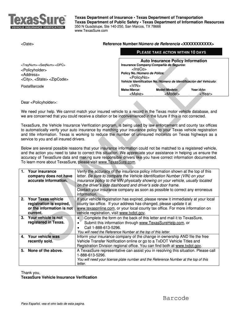 Texas Department of Insurance Texas Department of Transportation Texas Department of Public Safety Texas Department of Information Resources 350 N Guadalupe, Ste 140250, San Marcos, TX 78666 www.TexasSure.comDateReference