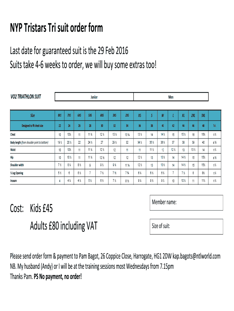 NYC Tristan TRI suit order form Last date for guaranteed suit is the 29 Feb 2016 Suits take 46 weeks to order, we will buy some extras too! Cost: Kids 45 Adults 80 including VAT Member names: Size