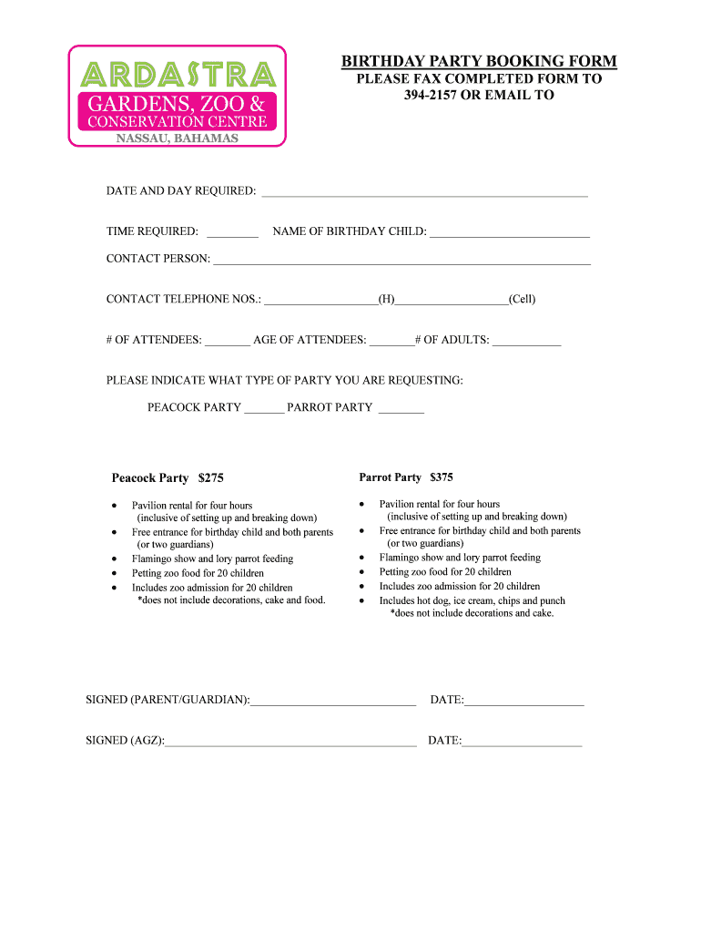 This document serves as a booking form for scheduling a birthday party, detailing the required information and services provided.