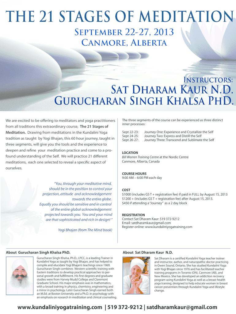 THE 21 STAGES OF MEDITATION September 2227, 2013 Can more, Alberta Instructors: Sat Dharma AUR N.D. Gurucharan Singh Sheila PhD. We are excited to be offering to meditators and yoga practitioners