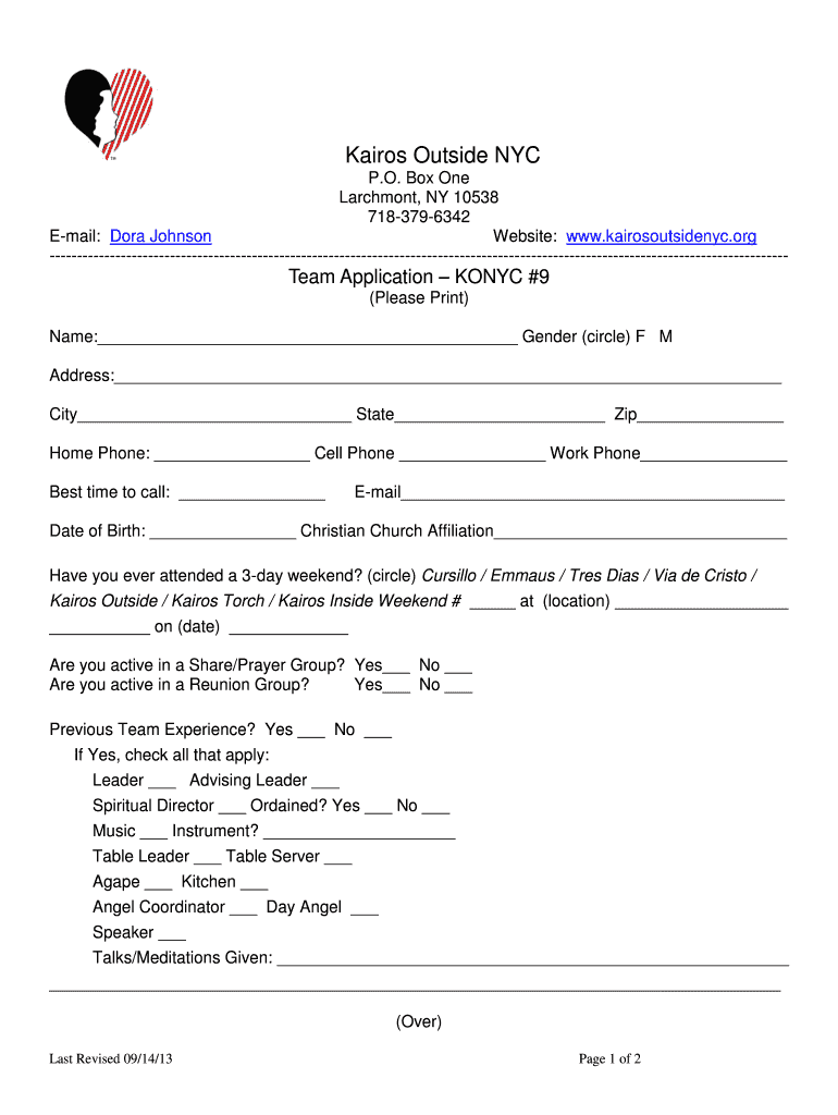 Kearns Outside NYC P.O. Box One Parchment, NY 10538 7183796342 Email: Dora Johnson Website: www.kairosoutsidenyc.org Team Application KO NYC #9 (Please Print) Name: Gender (circle) F M Address: City