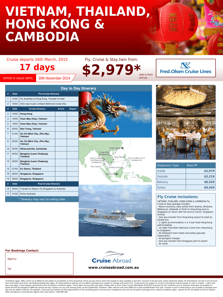 VIETNAM, THAILAND, HONG KONG & CAMBODIA Cruise departs 16th March 2015 Fly, Cruise & Stay twin from: 17 days OFFER IS VALID UNTIL 30th November 2014 ×2,979* rate is from and pp Day to Day Itinerary